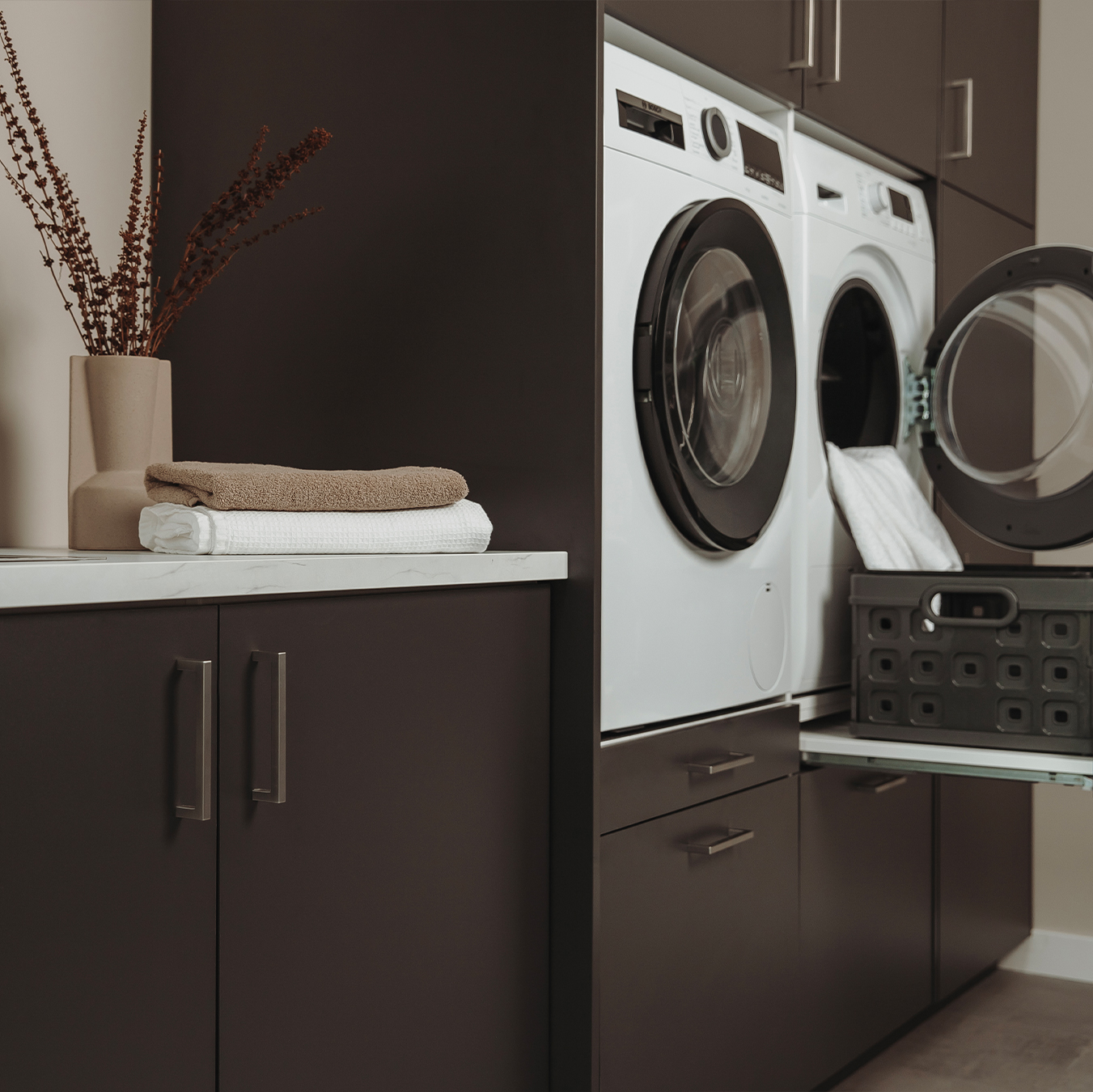 Moderne 'full house' wasmachinekast in 'feelwood black' met 'ara zwart matte' handgrepen, met geïntegreerde wasmachine en droger.